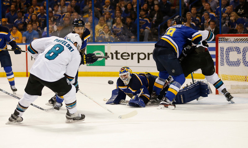 photo by bayareanewsgroup.com: San Jose Sharks Joe Pavelski tries to put one past the St Louis Blues goalie Brian Elliott last Sun May 15th at the Kiel Center