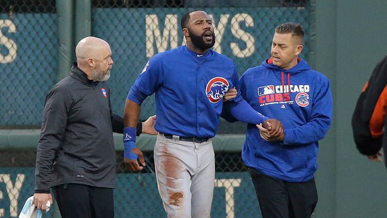 CSN Chicago capture: Chicago Cubs outfielder Jason Heyward who made a spectacular catch and then going head first into the padded fence left Friday night’s game against the San Francisco Giants with upper body injuries