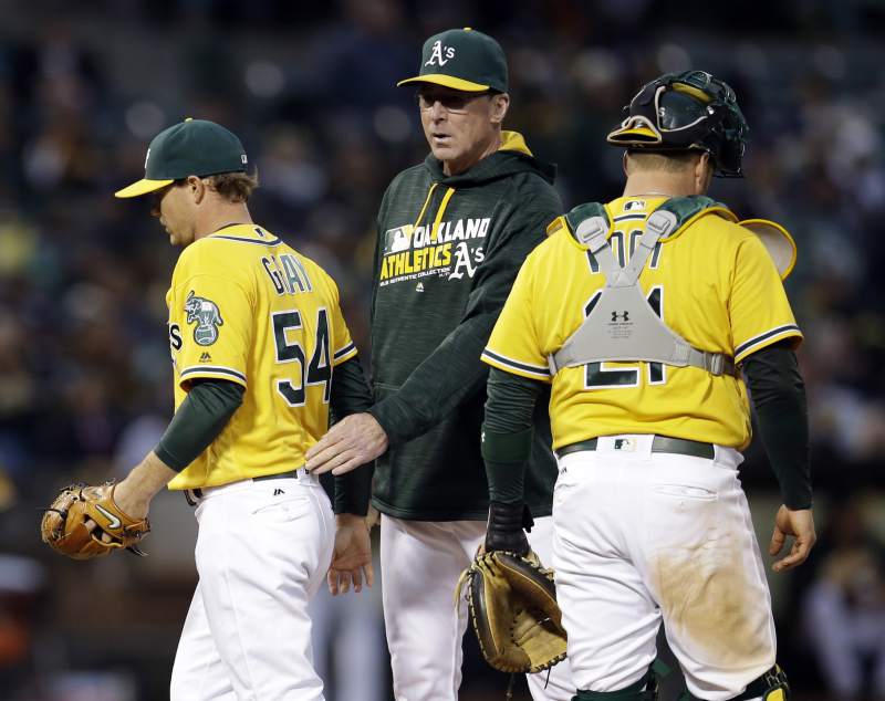 AP photo: Oakland A’s manager Bob Melvin pulls A’s starter Sonny Gray in the fourth inning of Friday night’s game at the Oakland Coliseum