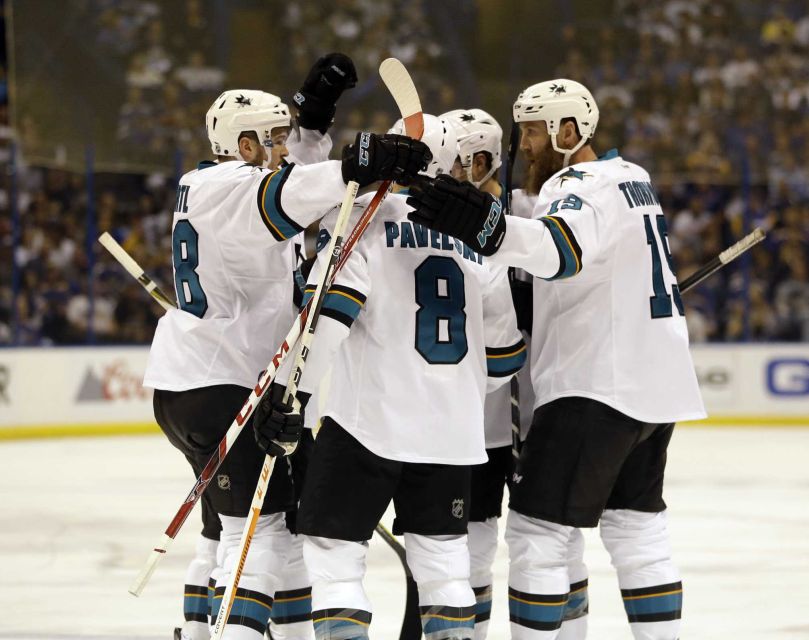 Marc-Edouard Vlasic scored his first goal of the playoffs, aided by Pavelski and Thornton at 3:51.