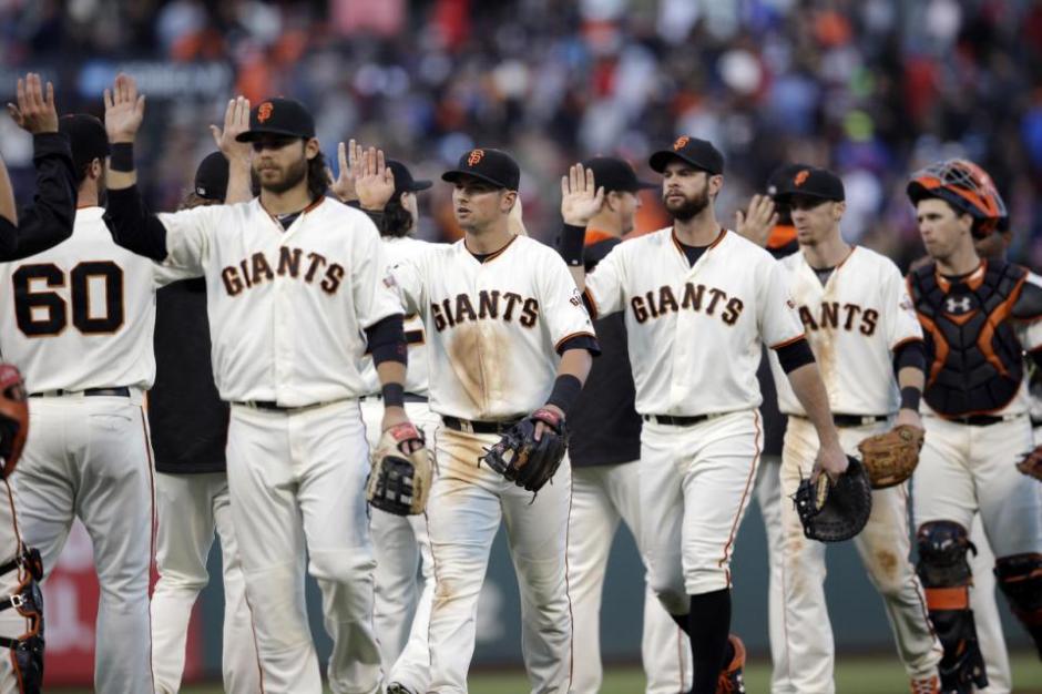 AP photo: San Francisco Giants congratulations all around as they get a 1-0 shutout against the Chicago Cubs on Sunday at AT&T Park