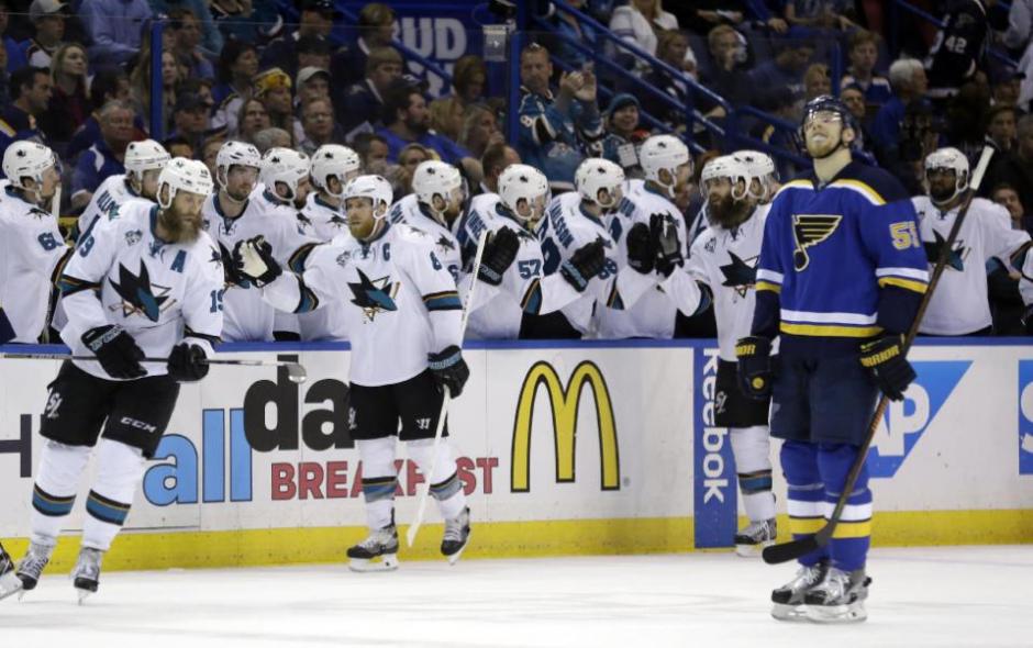 AP photo: San Jose Sharks center Joe Pavelski (8) gets a round of congratulations from his teammates after scoring in the second period on the St Louis Blues in game five Monday night at Scottrade Center
