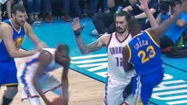 photo credit totalprosports.com: Golden State Warriors Draymond Green kick Oklahoma City Thunder Steven Adams in groin