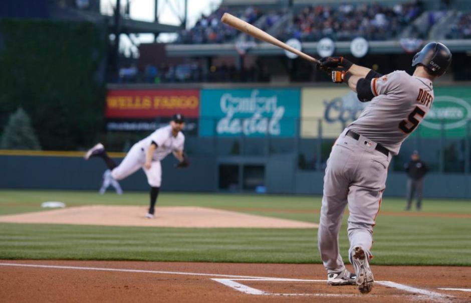 AP photo: San Francisco Giants hitter Matt Duffy (5) flies out after a pitch from the Colorado Rockies starter Tyler Chatwood in the first inning of Friday night’s game