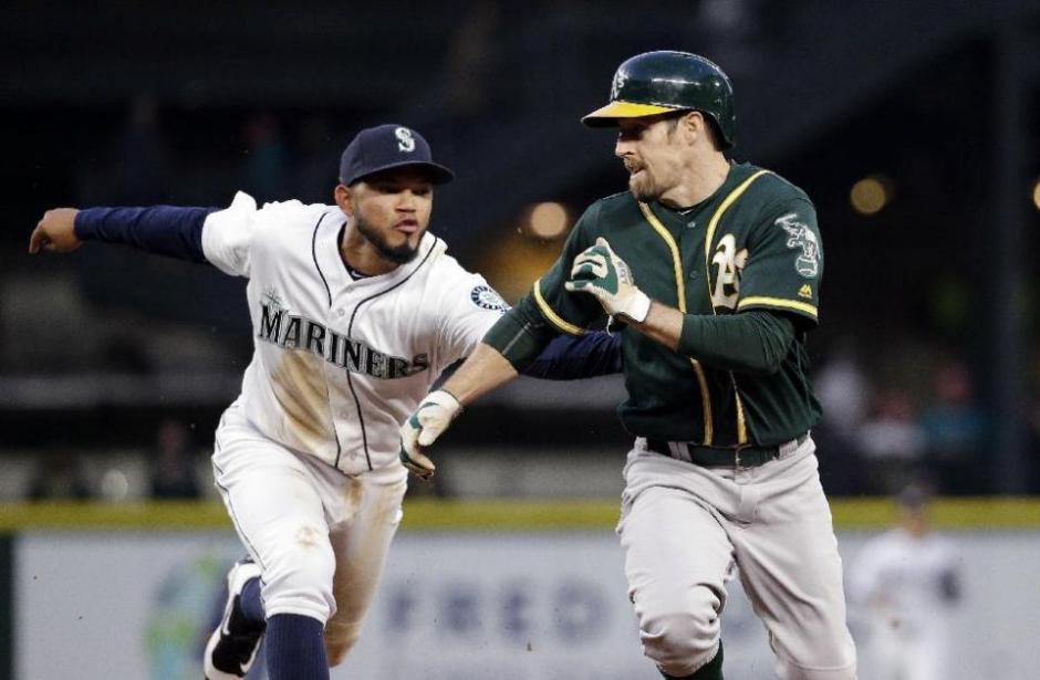 AP photo: The Seattle Mariners shortstop Luis Sardinas chases the Oakland A’s Billy Burns in a run down between first and second base in the fifth inning of Wednesday night’s game at Safeco Field in Seattle