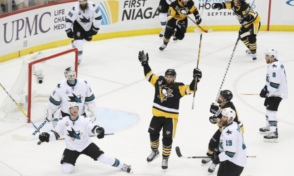 photo by USA Today: Pittsburgh Penguins Nick Bonino scores on San Jose Sharks goaltender Martin Jones at 2:33 in the third period for the go ahead goal on Monday night in game one of the NHL Finals