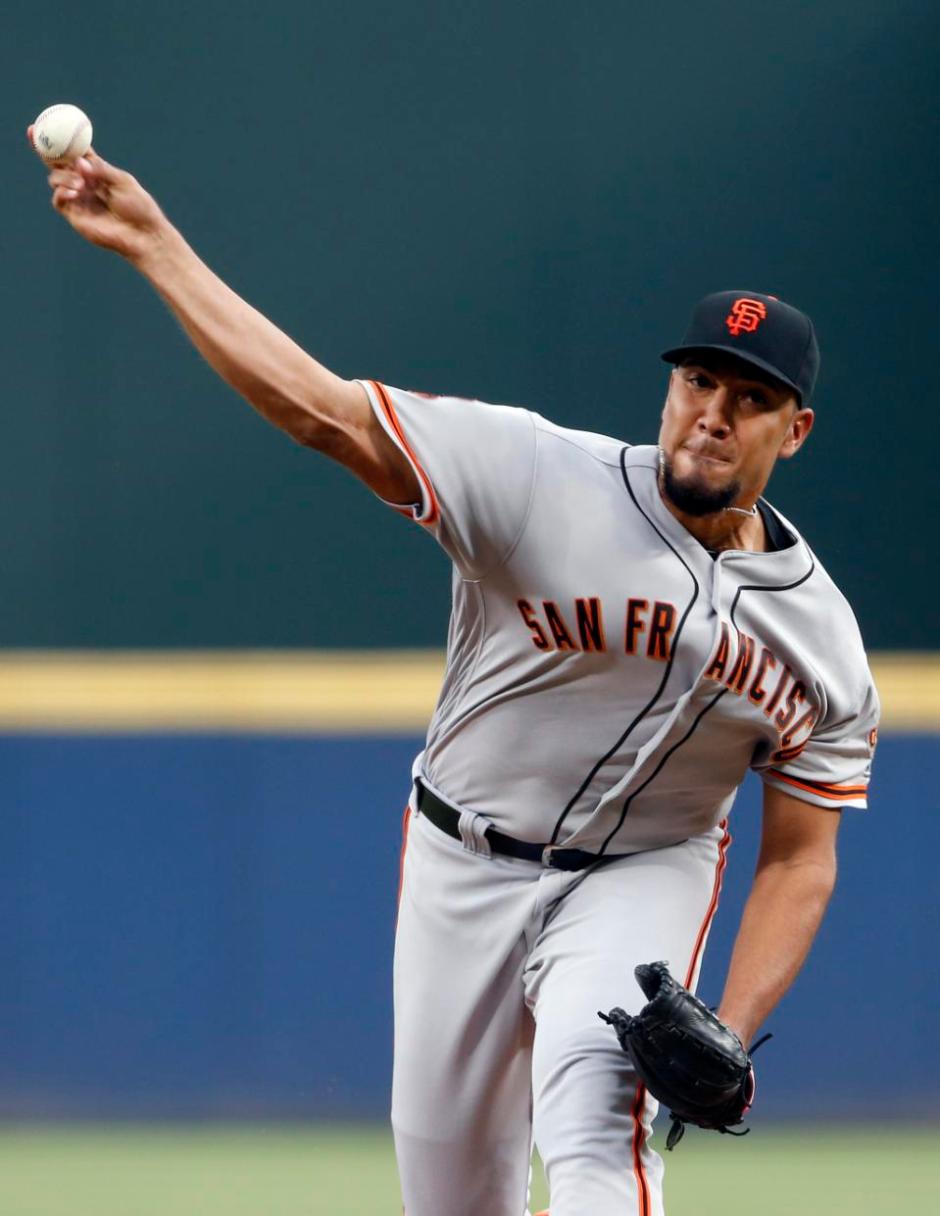 AP photo: San Francisco Giant starter Albert Suarez pitches in the first inning against the Atlanta Braves at Turner Field on Wednesday night
