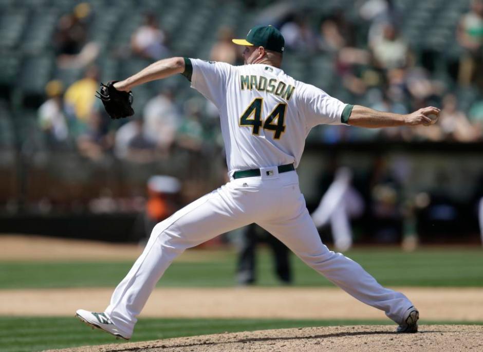 AP photo: Oakland A’s pitcher Ryan Madson throwing against the Minnesota Twins in the ninth inning on Wednesday at the Oakland Coliseum