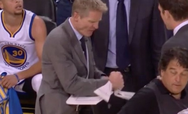 photo by larrybrownsports.com: Golden State Warriors head coach Steve Kerr breaks clipboard during a down third quarter at Oracle Arena during game one Thursday