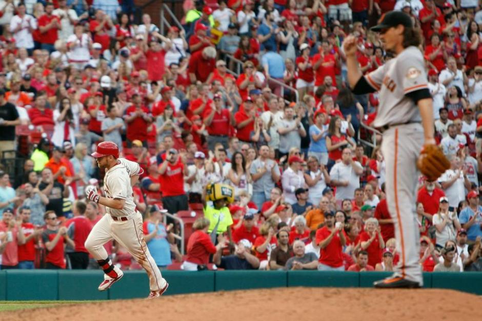 AP photo: St Louis Cardinal hitter Brandon Moss takes San Francisco Giants pitcher Jeff Samardzija deep in the fifth inning Saturday at Busch Stadium