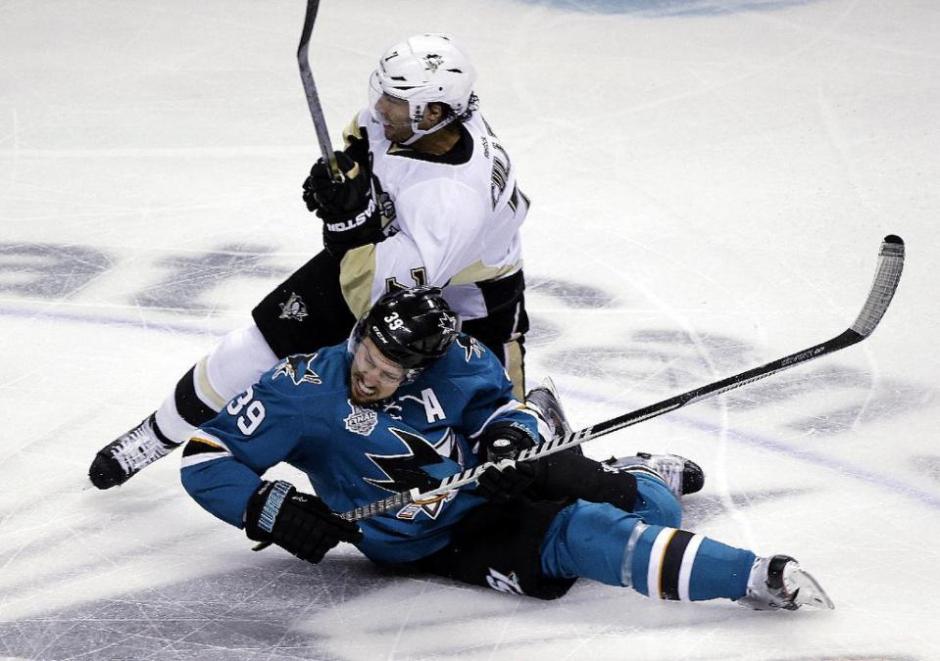 AP photo: The Pittsburgh Penguins Matt Cullen collides with the San Jose Sharks Logan Couture in the first period during game four at SAP Center on Monday night