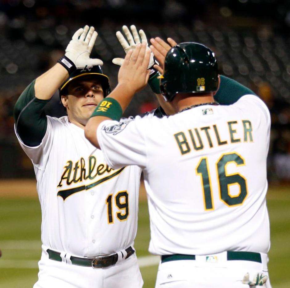AP photo: Oakland A’s Josh Phegley (19) is congratulated by Billy Butler (16) after hitting a three run homer off Texas Rangers pitcher Tom Wilhelmsen in the fourth inning Monday at the Oakland Coliseum