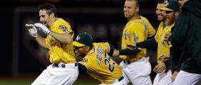 AP photo: The Oakland A’s Billy Burns gets mobbed by teammates after his walk off single vs. the Los Angeles Angels in the ninth at the Oakland Coliseum on Friday night
