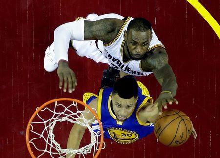 AFP photo: Game Six Golden State’s Stephen Curry and Cleveland Cav’s LeBron James in the NBA Finals go for the ball under the net