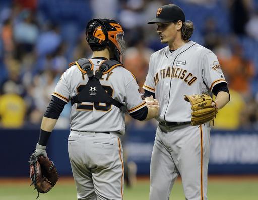 AP photo: San Francisco Giant pitcher Jeff Samardzjia gets a hand shake from catcher Buster Posey after Samardzjia picks up a four hitter at Tropicana Field on Friday night