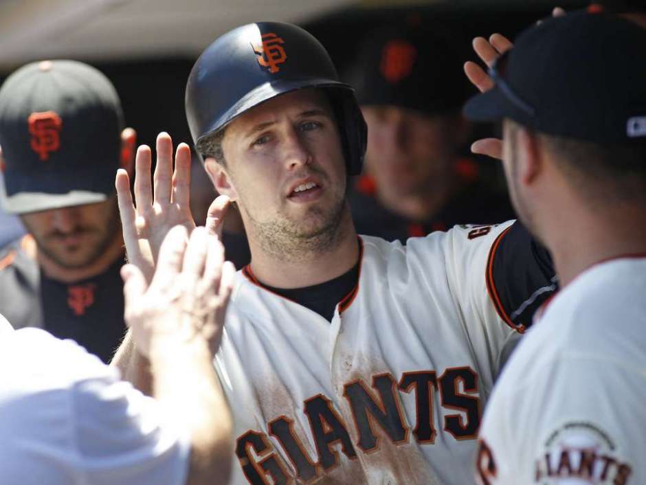 AP photo: San Francisco Giants catcher Buster Posey is congratulated after scoring in Sunday’s game versus the Philadelphia Phillies at AT&T Park