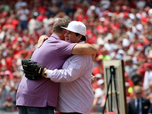 photo from Cincinnati.com: Pete Rose Jr hugs father Pete Rose Sr at number retirement tribute at Great American Ball Park on Sunday before San Diego Padres vs. Cincinnati Reds game