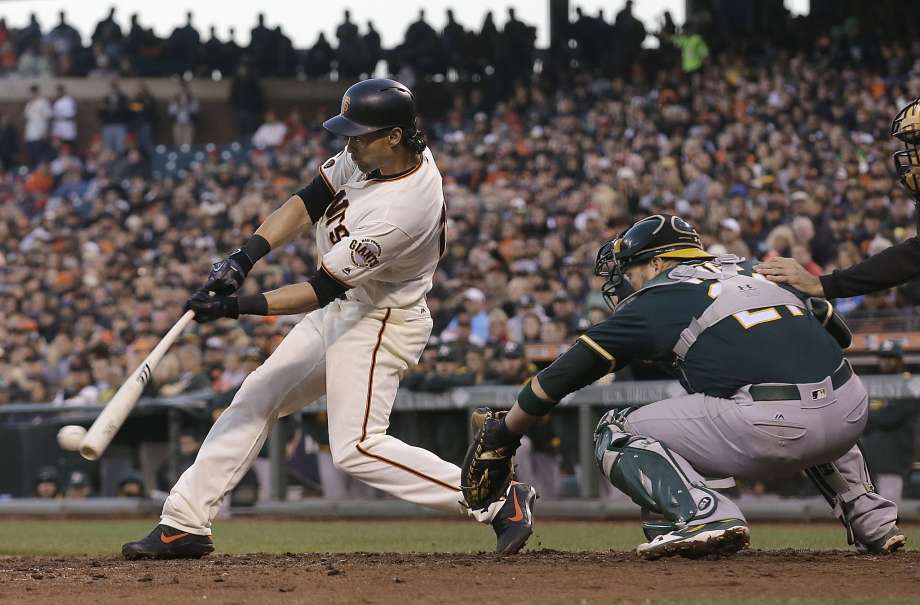 AP photo: San Francisco Giants hitter Angel Pagan hits for a two run single off the Oakland A’s the A’s catcher is Stephen Vogt in the fourth inning at AT&T Park on Tuesday night