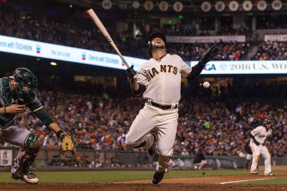 sfgate.com photo: Oakland A’s pitcher Marc Rzepczynski (not pictured) plunks San Francisco Giant hitter Gregor Blanco in the bottom of the seventh inning at AT&T Park on Tuesday night