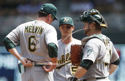 AP photo: A’s manger Bob Melvin left, Sonny Grey center, and A’s catcher Stephen Vogt talk it over in the fifth inning on the mound at Target Field on Wednesday