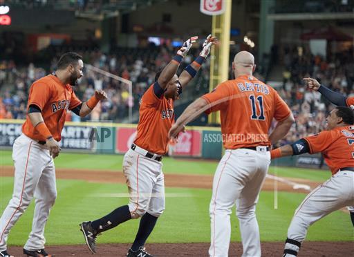 AP photo: The Houston Astros Luis Valbuena gets the warm welcome after hitting a walk off homer in the ninth to beat the Oakland A’s at Minute Maid Field on Friday
