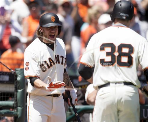 AP photo: San Francisco Giants pitcher Jake Peavy greets Grant Green after Green hit a two run homer in the fourth inning at AT&T Park on Saturday vs. the Arizona Diamondbacks