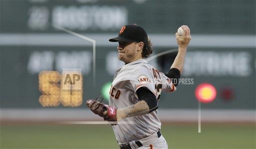 AP photo: Former Boston Red Sox Jake Peavy pitching for the San Francisco Giants delivers a pitch in the first inning in Fenway Park on Tuesday night