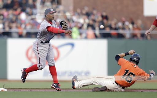 AP photo: Washington Nationals Wilmer Difo turns the double play on the San Francisco Giants Joe Panik’s ground ball the Giants Angel Pagan is out sliding at second base in the first inning at AT&T Park on Friday night