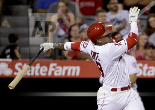 AP photo: The Los Angeles Angels Jefry Marte watches the flight of the ball for a three run homer off Oakland A’s pitcher Sean Manaea in the sixth inning at Angels Stadium on Tuesday night