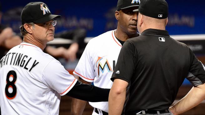 csnmidatlantic.com photo: Florida Marlins batting coach Barry Bonds argues with the plate umpire that he didn’t say anything from the dugout after being ejected as Marlins manager Don Mattingly stands between them during the Florida Marlins and San Francisco Giants game Wednesday at Marlins Park in Miami