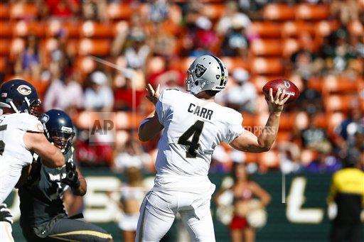 AP photo: Oakland Raiders quarterback Derek Carr appearing in photo at the 2016 Pro Bowl in February at Aloha Stadium in Honolulu throwing for Team Rice is prepared for Friday night’s game in Arizona the first pre season game for the Raiders