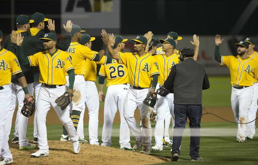 AP photo: There’s a celebration going on after the Oakland A’s defeat the Seattle Mariners at the Oakland Coliseum on Friday night