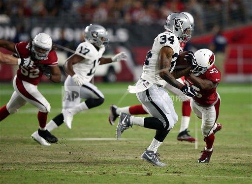 AP photo: Oakland Raiders running back George Atkinson III (34) breaks a tackle by the Arizona Cardinals Cariel Brooks (35) late in the third quarter as the Raiders take a 24-10 lead at the University of Phoenix in Glendale AZ
