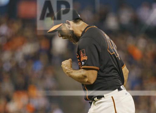 AP photo: Gotcha! San Francisco Giants pitcher Madison Bumgarner exclaims after striking out Baltimore Oriole Steve Pearce in the seventh inning at AT&T Park on Saturday night