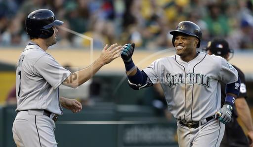 AP photo: The Seattle Mariners Robinson Cano crosses home after hitting a two run blast and is greet by Seth Smith (7) in the fifth inning at the Oakland Coliseum on Saturday night