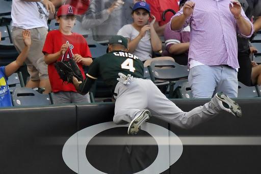 AP file photo: Oakland A’s Coco Crisp dives into the Angels Stadium crowd for a Ji Man Choi of the Los Angeles Angels ball that Crisp wound up catching preventing a home run in the Thursday August 4th game