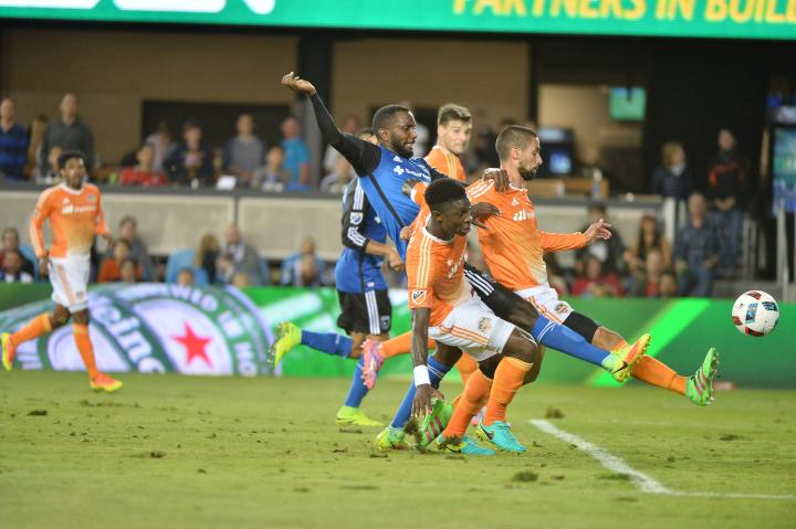sjearthquakes. com photo: Victor Bernandez finds the inside of the net for the San Jose Earthquakes first and only goal of Friday night against the Houston Dynamos at Avaya Stadium in San Jose