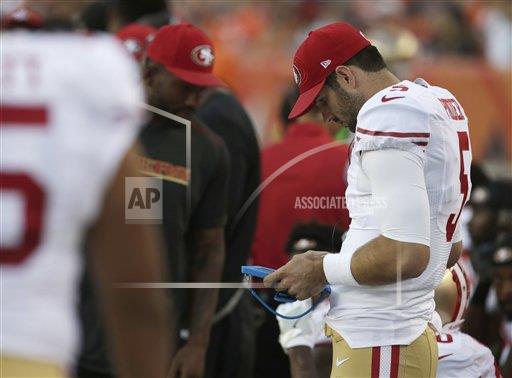 AP photo file: San Francisco 49ers quarterback Christian Ponder’s chances are a long shot for the starting job as he tries to make the team while holding the tablet during their game in Denver on Sat Aug 20th