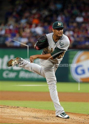 AP file photo: Oakland A’s pitcher Sean Manaea pitches against the Texas Rangers on August 17th