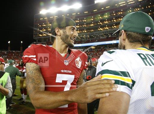 AP file photo: San Francisco 49ers quarterback Colin Kaepernick and Green Bay Packers quarterback Aaron Rogers meet at midfield following their pre season game August 26th