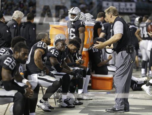 AP file photo: Oakland Raiders head coach Jack Del Rio lays it down for safety Karl Joseph (42) and strong safety Nate Allen (20) during the second half of last Saurday’s game against the Tennessee Titans