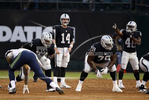 AP photo: Quarterback Matt McGloin calls the signals for the Oakland Raiders offensive line at the Oakland Coliseum against the Seattle Seahawks in the final pre season game on Thursday night