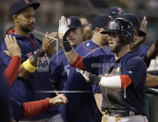 AP photo: Dustin Pedroia comes into score for the Boston Red Sox is greeted by teammates against the Oakland Athletics on Friday night at the Oakland Coliseum