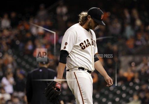 AP photo: San Francisco Giant pitcher Stephen Okert can only hang his head after surrendering a three run homer to San Diego Padre hitter Ryan Schimpf in the top of the ninth at AT&T Park on Tuesday night
