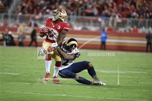 AP file photo: San Francisco 49ers running back Carlos Hyde (28) who scored twice on Monday night gets tackled by the Los Angeles Rams at Levis Stadium