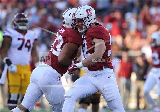 AP photo: Linebacker Casey Toohill celebrates with teammate Mike Tyler as the Stanford Cardinal win their second game this season on Saturday over the SC Trojans at Stanford Stadium