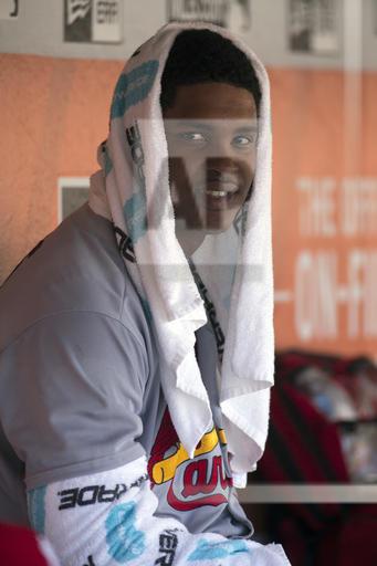 AP photo: St Louis pitcher Alex Reyes sits in the dugout to cool off during the fourth inning held the San Francisco Giants to only four hits in seven innings for his first win at AT&T Park on Sunday