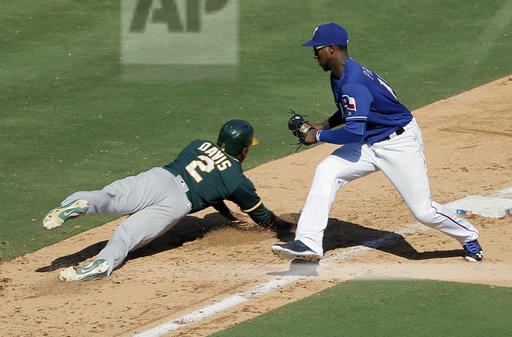 AP file photo: Oakland A’s Khris Davis dives back into the bag before the Texas Rangers Jurickson Profar can apply the tag in a double play attempt last Sunday Sep 18th at the Ball Park in Arlington