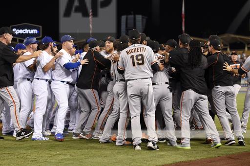 by Jessica Kwong AP photo: Los Angles Dodger hitter Yasiel Puig didn’t take to San Francisco Giant pitcher Madison Bumgarner pumping his fist after striking out the Dodger superstar which led to words and an on field brawl between the two clubs in the seventh inning LOS ANGELES–Starting pitcher Madison Bumgarner left the mound on Monday night with a 1-0 lead after getting Yasiel Puig out in the seventh inning, which led to the latest brawl between the two, but the San Francisco Giants’ bullpen couldn’t get the job done. The Dodgers rallied for two runs in the ninth inning to top the Giants 2-1, earning their sixth walk-off of the year and lowering their magic number to 7 to clinch the National League West. Giants manager Bruce Bochy said Bumgarner, who allowed just one hit and struck out 10, “threw a beautiful game” at Dodger Stadium and the loss “was a shame.” “Just couldn’t hold on there,” Bochy said. San Francisco took a 1-0 lead in the third inning when Angel Pagan was batting. Clayton Kershaw threw a wild pitch and allowed Eduardo Nunez to score. The Dodgers remained scoreless through the seventh inning, when Bumgarner got Puig out and pumped his fist. The two began to stare each other down and yelled, “Don’t look at me.” The benches cleared and Brandon Belt and George Lombard stepped in between the two. No punches were thrown. “There’s a lot of history of it,” Bochy said of Bumgarner vs. Puig. “They’re not going to go out to dinner.” Bumgarner didn’t return to the mound after that. Bochy said the brawl didn’t play into the decision. “We talked. I’ll leave it at that,” said Bochy, unwilling to elaborate on the conversation. Bumgarner reiterated, “I don’t think I got thrown out.” “You don’t ever want to come out of the game. At the same time, you’ve got to be smart about it,” he said. The bullpen blew it for Bumgarner in the ninth inning facing Javier Lopez, the Dodgers’ Corey Seager singled Andrew Toles to third base. Then Giant reliever Hunter Stickland came in to face Justin Turner who singled on a ground ball to right fielder Hunter Pence and Toles scored, tying the game at 1-1. Los Angeles’ Adrian Gonzalez doubled on a fly ball to Pence that glanced off the heel of his glove and Seager scored, giving the Dodgers the 2-1 victory. “We’ve got a lot of guys who are really good in the bullpen. It didn’t work out for us tonight,” Bumgarner said. Lopez said that in the last two weeks of the season, “You don’t want any game to get away, especially to the division leader.” Dodgers starting pitcher Clayton Kershaw allowed one unearned run on three hits in six innings. Los Angeles’ National League West lead over the second-place Giants is now six games. San Francisco remains one game behind the New York Mets and fell ties with the St. Louis Cardinals for second place in the Wild Card standings. Asked whether he thinks the Giants will make the playoffs, Bochy said, “Of course.” “It’s a tough group out there,” he said. “I’ll never lose that confidence.” First pitch for the second in the three-game series between the California rivals is 7:10 p.m. Tuesday at Dodger Stadium.