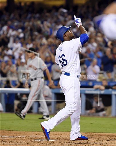AP photo: Los Angeles Dodgers Yasiel Puig points heavenward after hitting a three run home run in the fist inning off the San Francisco Giants Matt Moore during a six run rally